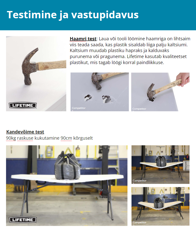 Lifetime pukklaud 110cm on läbinud range ANSI/BIFMA X5.5-2021 standardi testimise, mis on USA juhtiv kvaliteedinorm kommertsmööbli jaoks. See ei ole lihtsalt paberil olev sertifikaat – iga Lifetime laud on läbinud järgmised ranged testid: