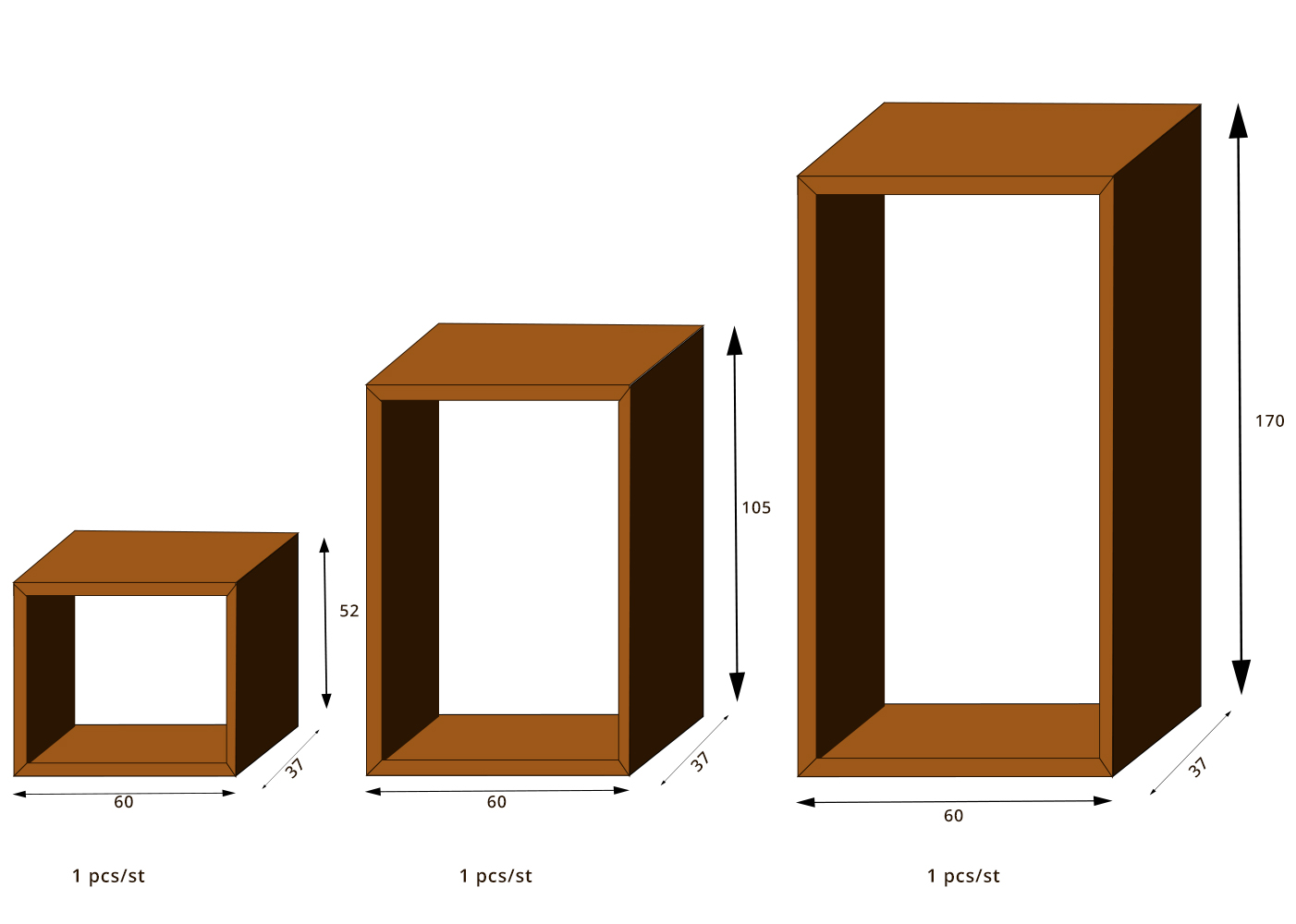• Komplektis 3 erinevat riiulit mõõtudega: