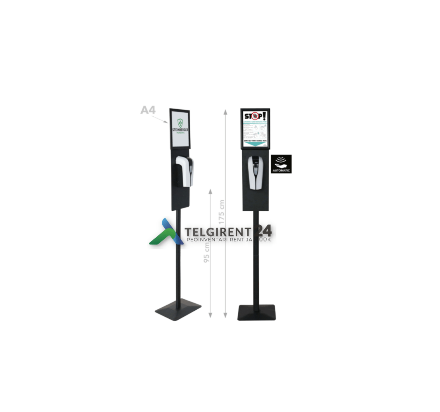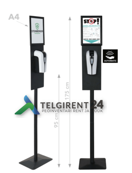 Automaatne desinfitseerimisjaam on stabiilne ja kompaktne Desinfitseerimisjaam on puutevaba ja seega tõhus vahend haiguste leviku tõkestamisel Värv: must Kerge transportida – saab lihtsalt osadeks võtta Desinfitseerimisjaam infotahvliga – desojaama infotahvlile saab panna Teie firma logo koos juhistega NB! Desojaama rent sisaldab desovahendit!